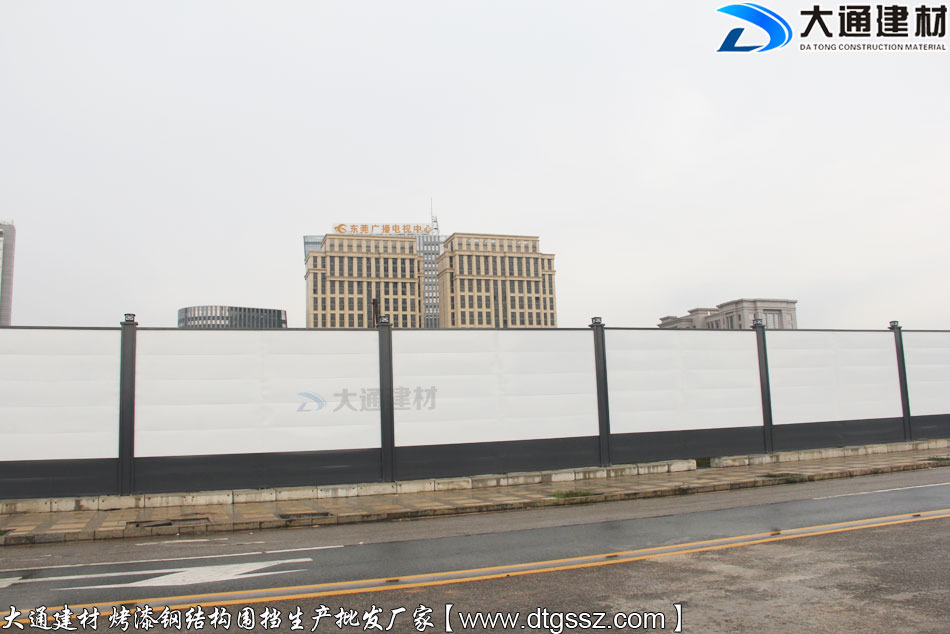 東莞廣播電視中心附近施工工程項目使用大通建材根據用戶的需求定制化生產的4米高的鋼結構圍擋,這款圍擋是大通建材推出的性價比很高的A類烤漆圍擋半龍骨款,不僅具有美觀環保的特點,還拆裝方便、安全穩固、經久耐用,適合地產工程項目、市政建設施工、道路改造等工程使用。