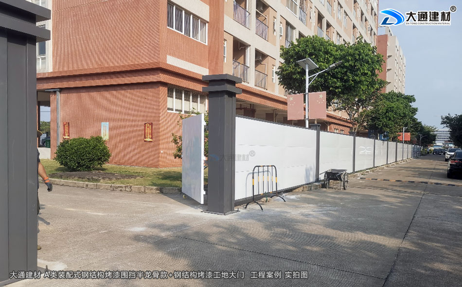 深圳市大通建材 A類烤漆鋼圍擋2米高半龍骨款與烤漆鋼結構工地大門 應用到惠州項目工程 圍擋案例實拍圖如下
