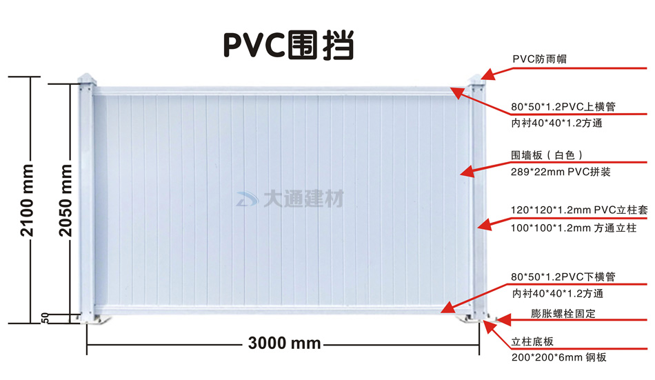 深圳市大通建材白色PVC圍擋的規(guī)格尺寸文字描述: