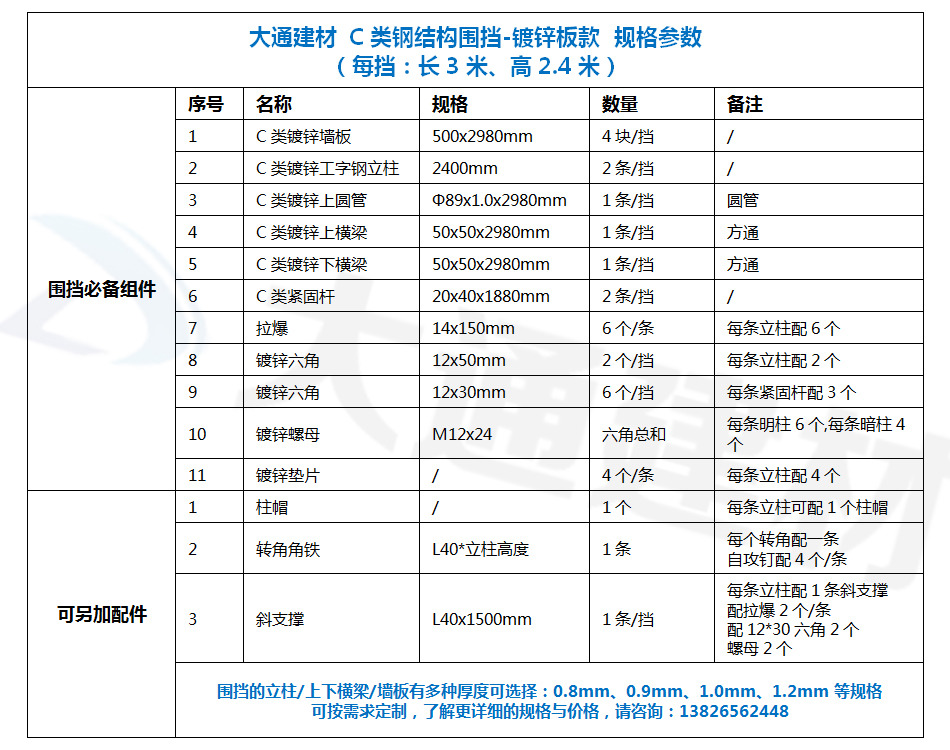 深圳大通建材C類裝配式鋼圍擋-鍍鋅板款通常作為圍墻護欄使用,起隔離防護作用。常規(guī)一擋的長度是3米、高度是2.4米和2.5米,若沒有特殊要求的項目工程按性價比來選擇鍍鋅鋼板圍擋款式建議是選擇鍍鋅鋼板圍擋c款的2.4米高的工字鋼立柱的普通款。如果對高度要求至少要2.5米高的工程,這種情況下建議使用H型鋼立柱鍍鋅鋼板圍擋c款。
