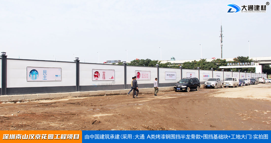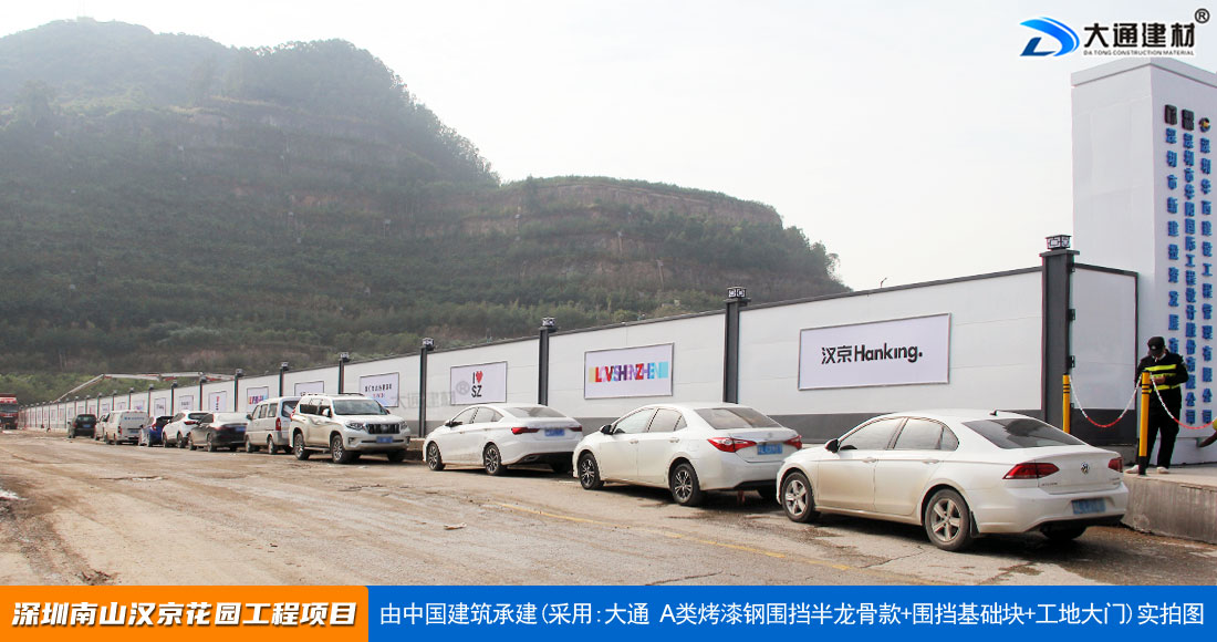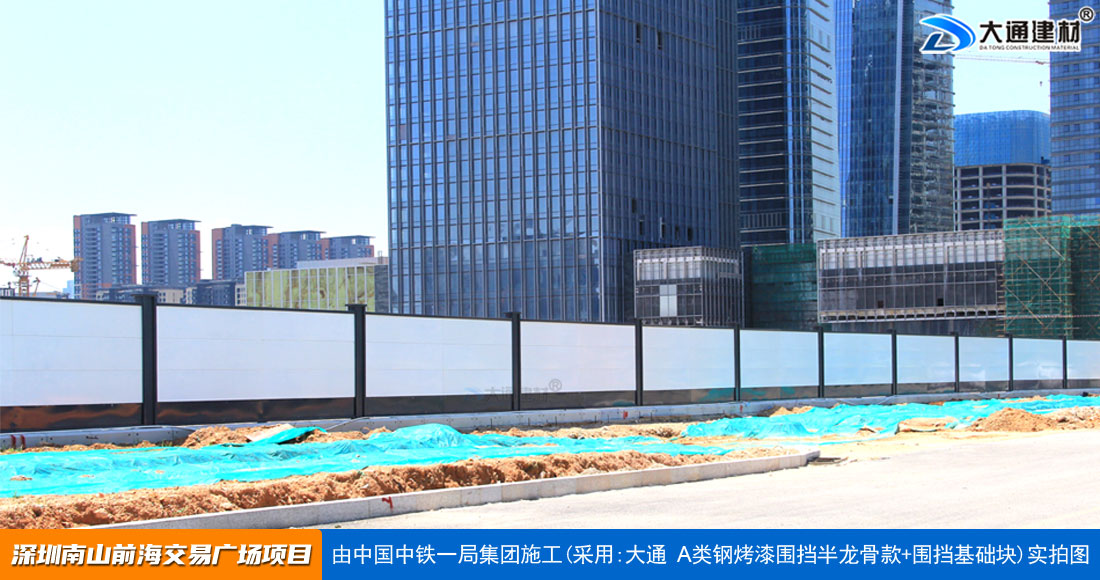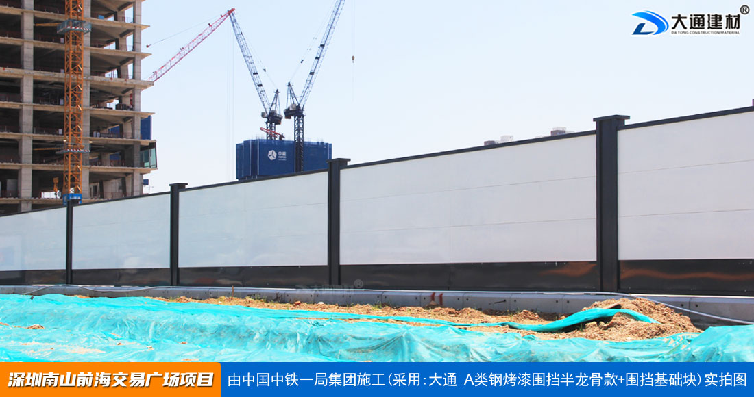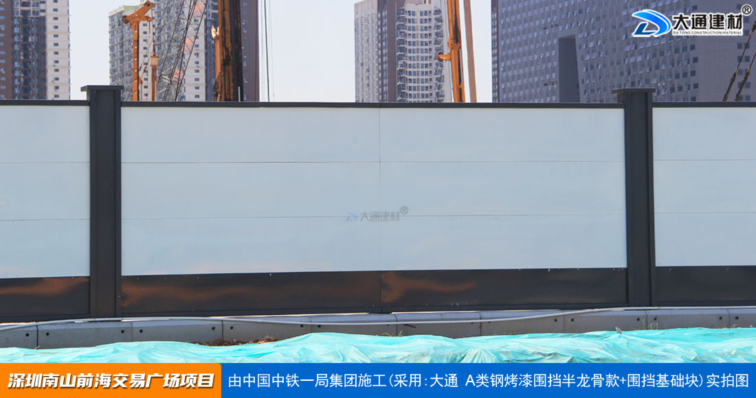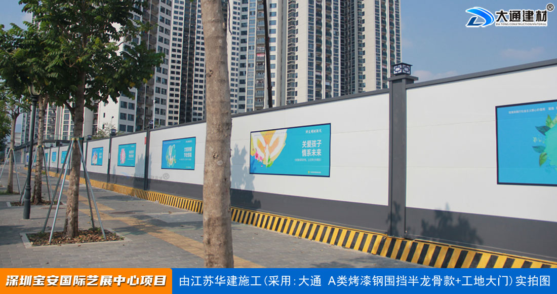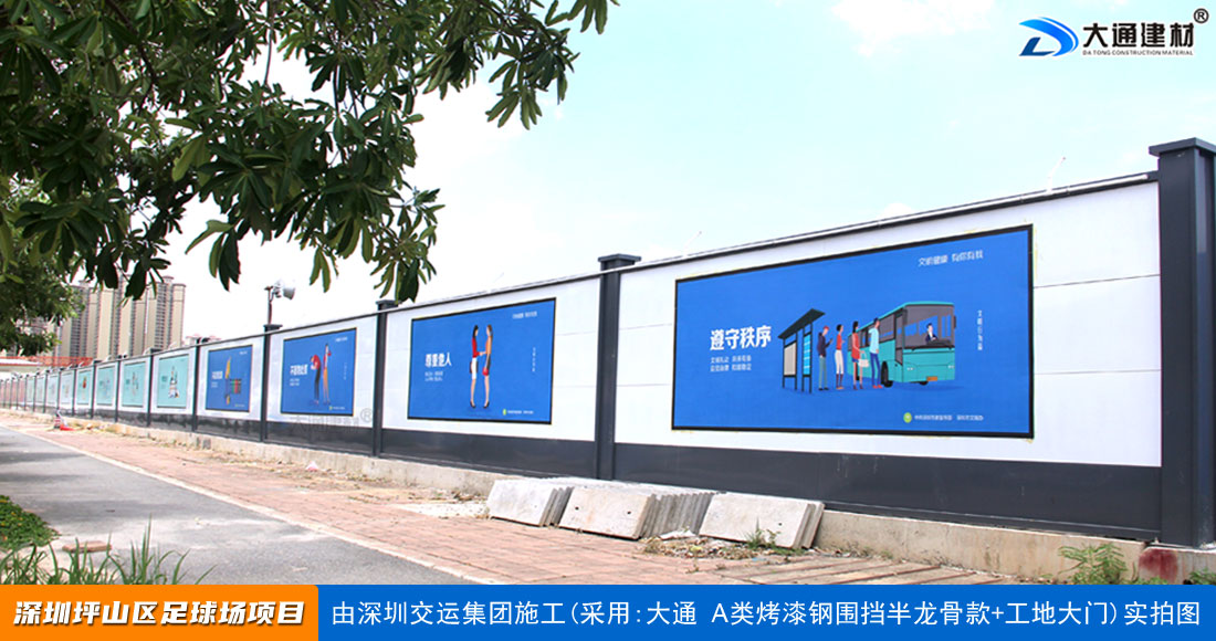 建設工程施工工地四周應按規定設置連續、密閉的鋼結構施工圍擋,建造多層、高層建筑的還應設置安全防護設施。在市區主要路段和市容景觀道路及市場、機場、碼頭、車站廣場等人流量、車流量比較多的地方設置的施工圍擋的高度不得低于2.5m,在其它路段設置的圍擋的高度不得低于1.8m。而深圳市大通建材A類鋼圍擋烤漆半/無龍骨款的標準高度是2.5米、長度為6.3米一擋,而圍擋高度特殊需求的如3/米/4/米/5米/6/米等高度的可以進行定制化生產。