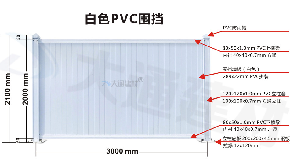 深圳市大通建材生產批發的市政標準PVC圍擋的圍擋墻板采用PVC長條版拼接,立柱、橫管均為PVC材料,內部均襯方通。立柱底板為鋼板,并加斜撐受力,來保證PVC圍擋抗風力更強、更安全穩固。大通建材常規款PVC圍擋尺寸長3mx高2.5m、長3mx高2.2m、長3mx高2m 其它PVC圍擋尺寸可按實際需要進行定制生產。